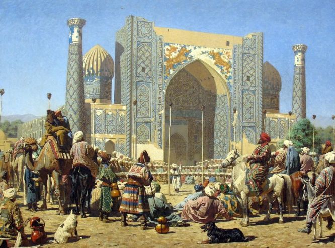 Timurid era Samarkand (“The Sher-Dor Madrasa in Registan” painting. Created by the artist Vasily Vereshchagin)